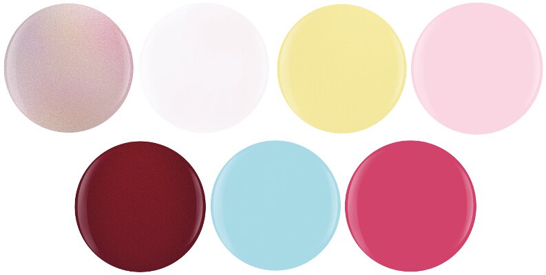 Gelish Beauty and the Beast shades, clockwise from top left: Enchanted Patina, The Last Petal, Gaston On and On, Days in the Sun, Potts of Tea, Plumette with Excitement, and Be Our Guest