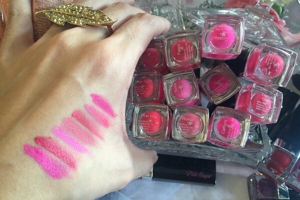 My favorite product from Pink Sugar is Sugar Tint Lip and Cheek Tint (P349) that goes on rich and creamy yet finishes matte and lasts all day, no kidding, even after eating and drinking! It has a sweet grape scent, too, for some reason. Make sure to put just a teeny-tiny dot on each cheek—I was serious about the pigments! Check out the swatches of all five shades below.