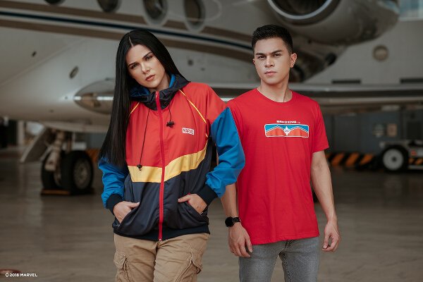As someone who grew up in the ‘90s, I love that the 0917 Lifestyle x Captain Marvel collection takes off from the movie’s ‘90s look, mixed with elements from military uniforms, all bearing Captain Marvel’s logo or trademark insignia. Take your pick from the different pieces: cool yet casual t-shirts, including one that features her cat, Goose (above); eye-catching, comfy outerwear such as a fatigue jacket and a colorful windbreaker (below); and nifty accessories like a tote bag and fatigue cap.