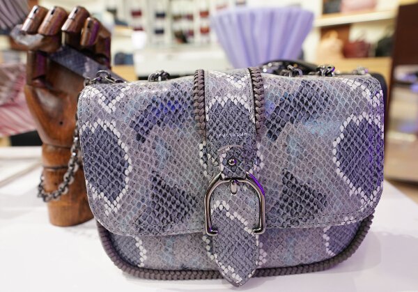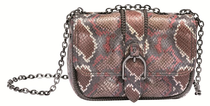 The one-of-a-kind and contemporary Amazone line has three different sizes of messenger bags. There are pieces crafted with supple leather in black and powder, as well as python-print calfskin in shades of dusty pink, blush, coral pink, gray. There’s even a version with gray and white gradations. Two versions in black or burgundy lambskin also have a wildly modern quilting design with a graphic look.