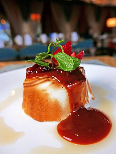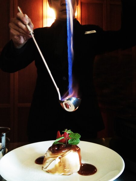No matter how full you are after the main course, you have to leave room for Baked Alaska, which is both a visual treat and a delight to eat! This dessert made of sponge cake and strawberry-vanilla ice cream covered in strawberry compote and browned meringue is flambéed with brandy right by your table, and it’s a real fire show! Consuming it is also quite the experience, as it’s warm on the outside, cold inside, sweet and sinful and delectable through and through. It’s not cloying, however, and the brandy actually balances out the sweetness rather than overwhelm you. I personally loved tasting the brandy in this one, as it gives the dessert a kick similar to that of my favorite fruit cake.