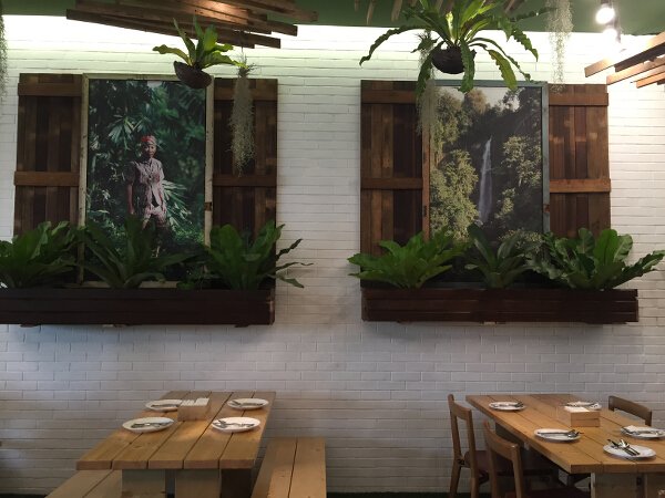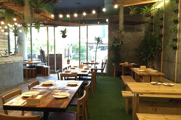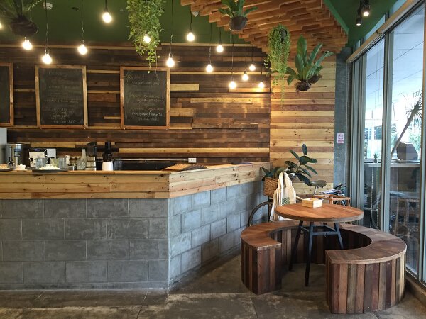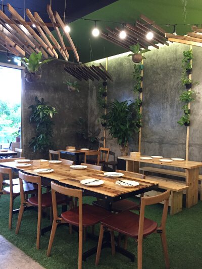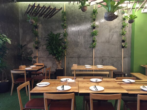 Most of the wood used on the walls and ceilings are repurposed wood, from old houses, while the picnic tables and chairs are made of wood from trees better chopped—so everything is in keeping with the sustainable lifestyle they promote. Most of the elements found in Earth Kitchen are natural, down-to-earth, and almost robust and rough. The whole space is surrounded by trees and hanging plants mixed with quirky antiques and lit by hanging globe lights.