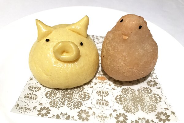 Volcano Bun (pig) and Ham Sui Kok (chick)