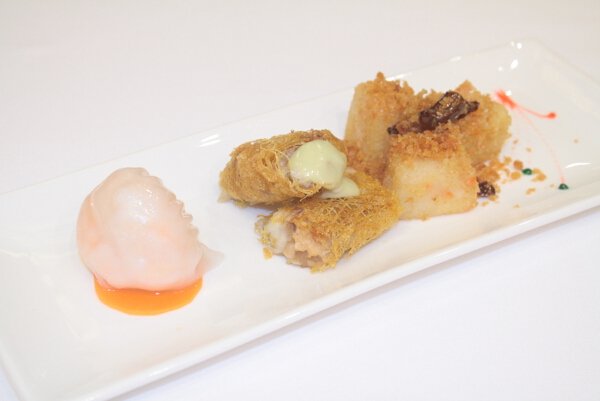 Dimsum sampler: Har Gao, Crispy Fried Shrimp Stuffed with Cheese, and Radish Cake