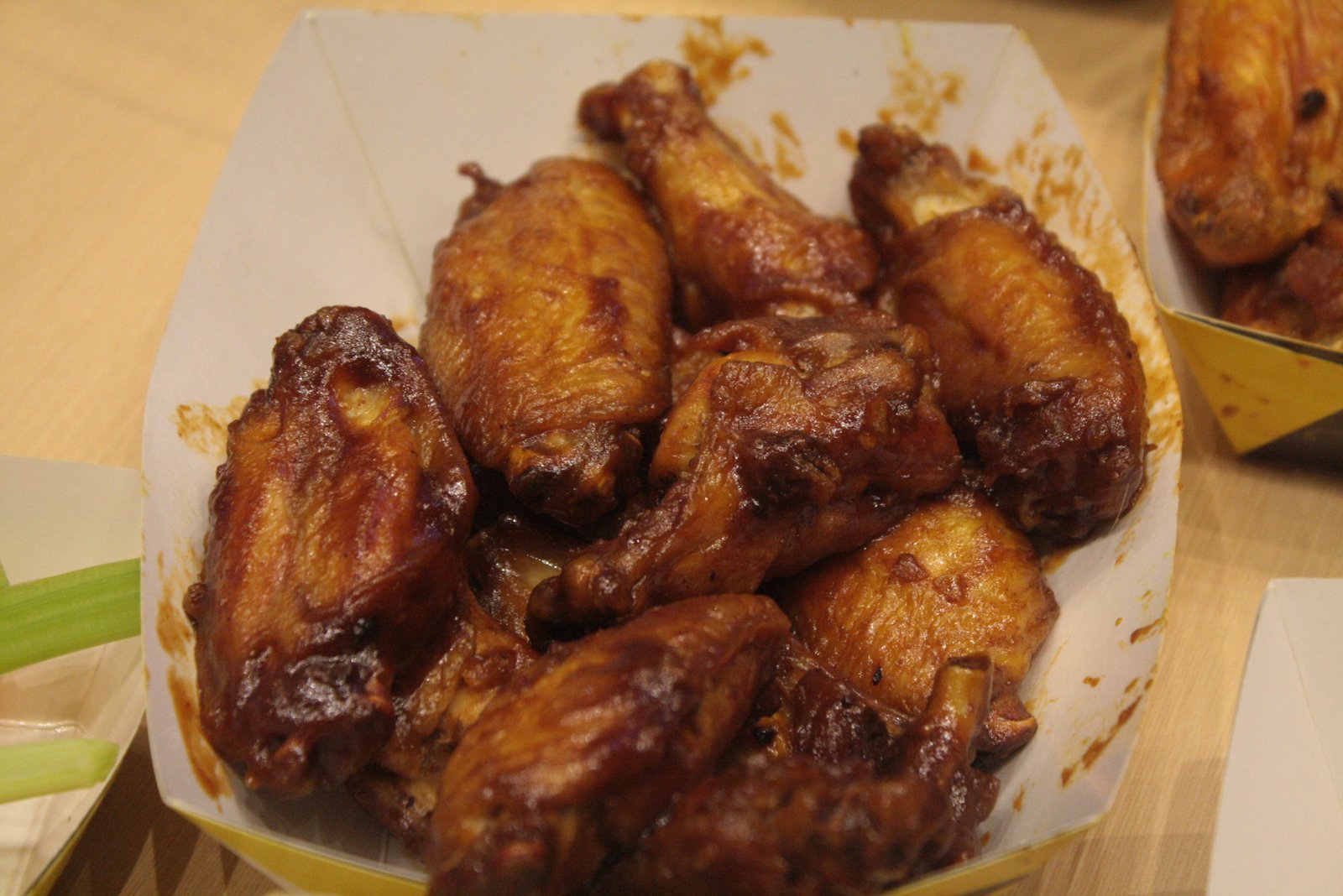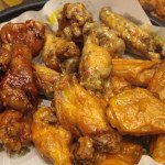 Medium serving of Wings in a mix of three sauces: Parmesan Garlic, Hot, and Honey BBQ.