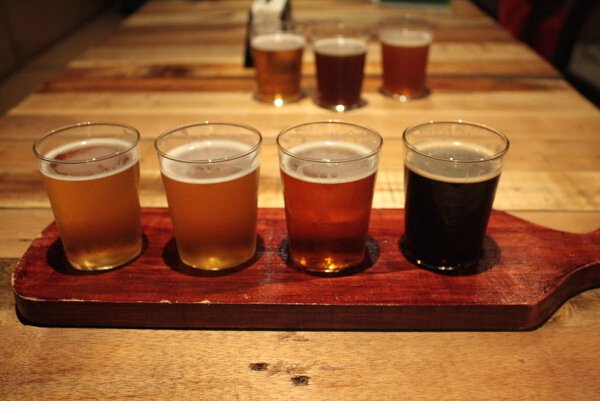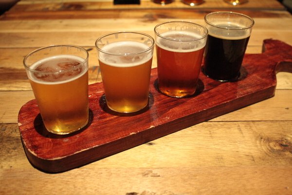 Drink from lightest to darkest: Pilsner, Weissbier (wheat beer), IPA, and Stout.