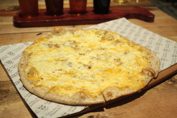 Brewery has a selection of 12-inch pizzas, all made of hand-rolled spent grain and beer dough. I tried the Microbrewery Beer Cheese Pizza (P420), made of home-made beer cheese sauce, mozzarella, parmesan, gruyere, and caramelized onions. It has all things I love in one pizza: beer flavour, types of cheese I like, a subtle sweetness, and a super thin crust. It’s one of the best cheese pizzas I’ve ever tried! It’s creamy and cheesy—oh, the smell!—and there’s an earthy taste and texture to the crust because of the mix of spent barley and wheat grains not used in the brewing process, mashed together. Its interesting grainy texture is like that of multigrain crackers.