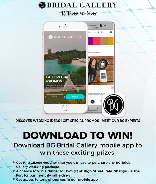 Brides who download the app have the chance to win prizes, like a P25,000 voucher they can use to purchase any BG Bridal Gallery wedding service and dinner for two at High Street Cafe, Shangri-La The Fort at the monthly draw.