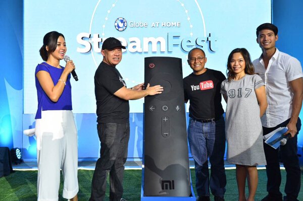 (L-R) Globe At Home StreamFest host Bianca Gonzalez, Globe President & CEO Ernest Cu, Country Head of Google Philippines Kenneth Lingan, Globe At Home Head of Marketing Barbie Dapul, and StreamFest co-host Mikael Daez with a giant AndroidTV box remote