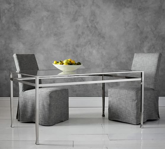 The soothing palette from Pottery Barn’s collections this season, while subdued, can be played up according to your tastes by layering on different textures like distressed wood and natural fibers with polished-nickel, glass, and Carrara marble with their Tanner, Alexandra, and Ivy Table Collections for a balanced look of rustic seaside elegance.