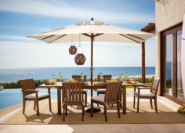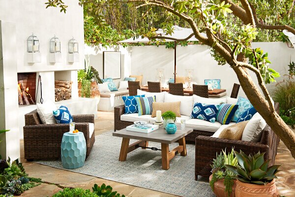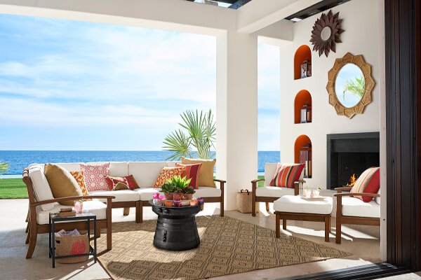 Their latest collection includes outdoor furniture, like in all-weather wicker; colorful outdoor pillows featuring everything from ikats and suzanis to animal prints and embroidered designs offered in two coordinating color palettes, warm and cool; shatterproof melamine dinnerware for outdoor entertaining; turquoise pieces; and metallic accent pieces like those from Shimmering Mirror Hurricanes.