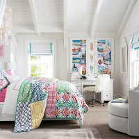 The range of products, including furniture, bedding, window treatments, rugs, lighting, gear, decorative accessories, and storage solutions, are available in fresh, fashionable options that appeal to the tastes of tweens and teens (and even teens-at-heart, like ME!). Many of the items can be personalized with a name or initials in a variety of fonts.