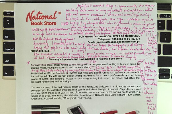 In this age where touchscreen is replacing the keyboard, some people almost forget what the keyboard slowly replaced: handwriting. I personally find it both sad and happy that calligraphy is all the rage these days: I’m happy that people are once again using their hands to write; sad because handwriting is now but a novelty, a hobby, a current passion or trend—instead of something we all had to learn and use to communicate, get points across, to remember things by. I don’t want my handwriting to become like Algebra or Trigonometry—something I’ve forcefully tucked away in the farthest corners of my mind. I know people who can no longer even write in script.