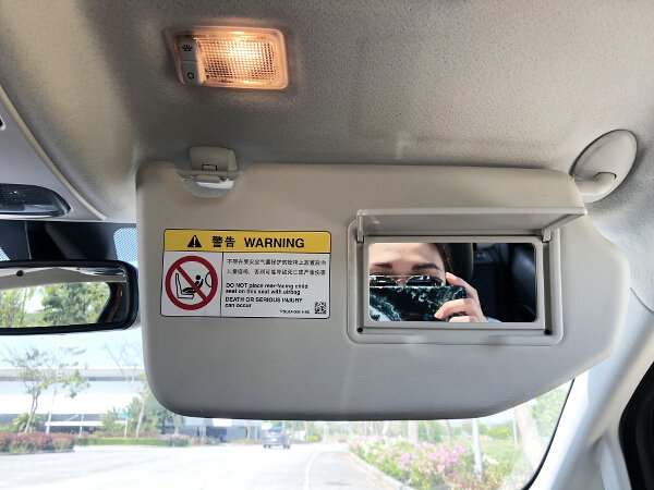 I love that behind the passenger’s sun visor, there’s a vanity mirror and light for touch-ups, day or night!