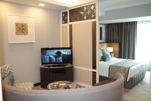 Living area and bedroom of the Executive junior suite/studio. Notice the sliding doors that separate the living area and bedroom, making it practically a 1BR?