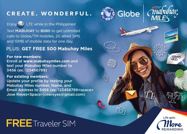 New members need to enroll at mabuhaymiles.com and text their Mabuhay Miles number using the Traveler SIM to 3456. Existing members can update their profile by texting their Mabuhay Miles number, name, and email address to 3456. Passengers can buy prepaid load at the Globe booths at NAIA 2 (PAL terminal), other international airports nationwide, and at over 800,000 Globe retailers around the country.