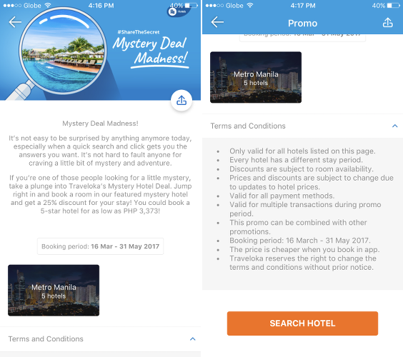 Traveloka’s irresistible deals revolve on the masthead. What interested me the most was Mystery Deal Madness: Traveloka has featured mystery hotels at super discounted room rates. At the time I checked, a 5-star hotel was available for as low as P3,373. They don’t tell you what hotels are featured, just how many stars these hotels have, the discounted price, and the location. I checked out what the five-star hotel was and found that it’s located in Alabang. It also lists establishments close by and a description of the hotel to give you an idea if you’d like to book.