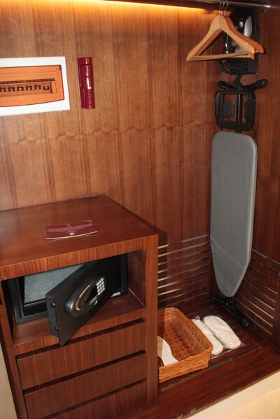 Spacious closet complete with drawers, hangers, an iron and ironing board, bedroom slippers, flashlight, and safe.