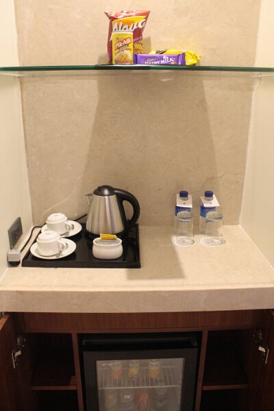 Our room’s mini bar and coffee station
